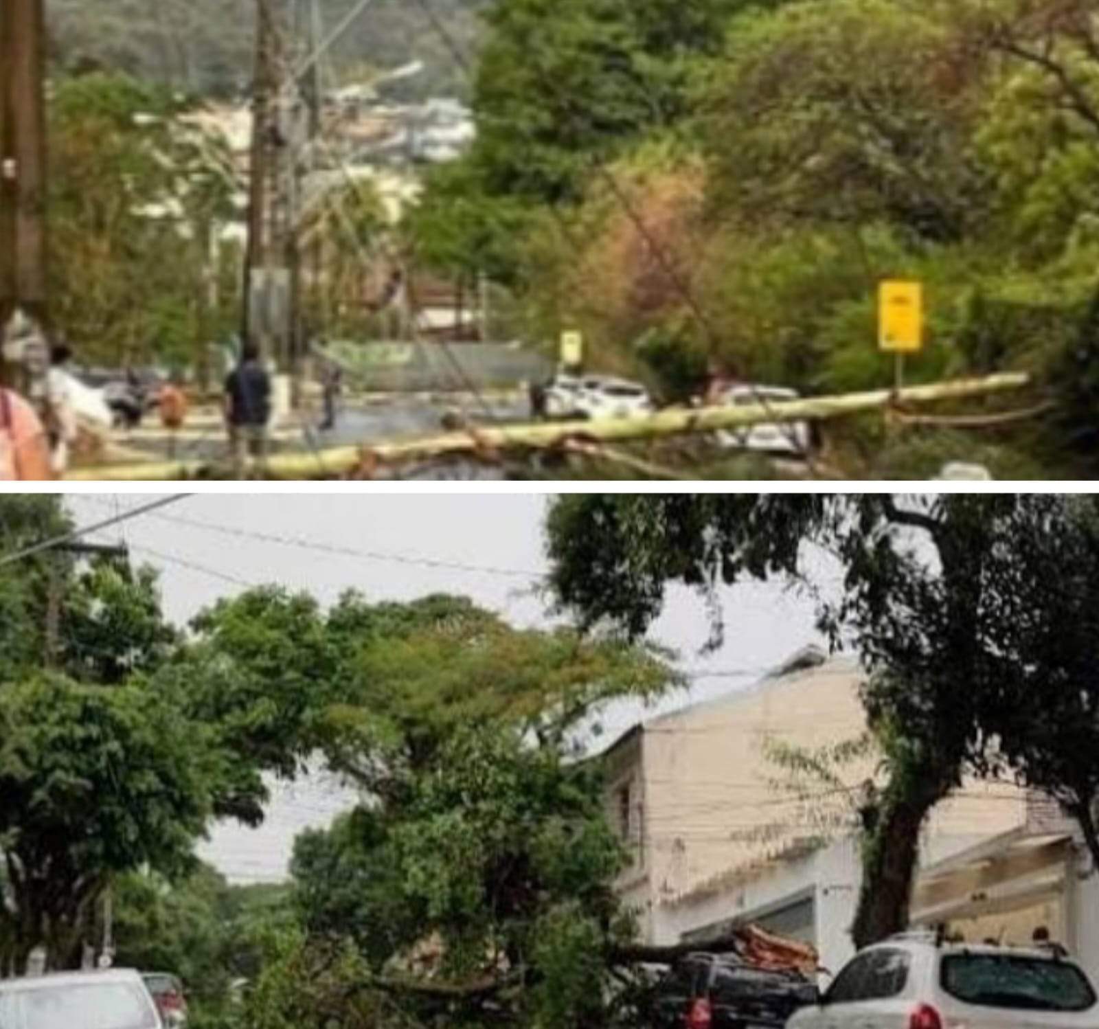 “A chuva estava guardada há muito tempo e, quando chega, derruba tudo. Não temos previsão de quando a energia vai voltar. Foi muito vento, e essa área é cheia de árvores. Esse eucalipto era muito alto e perigoso, bateu na casa vizinha e derrubou três postes na esquina. Todo mundo torcia pela chuva, mas, quando veio, causou esse estrago”, disse.