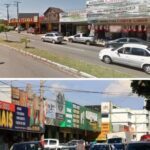 Rua em Águas Claras com fita de isolamento policial e viatura da PMDF, representando incidente de violência envolvendo piloto.